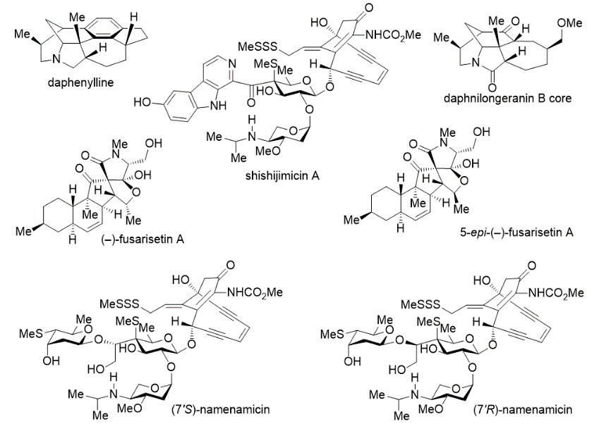 2. 基于新的合成方法和合成策略,实现结构复杂的天然产物高效全合成。