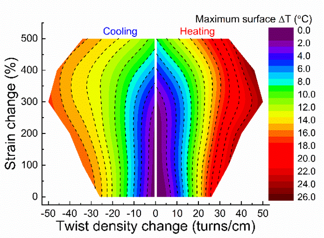 研究人员先将这些刚性高分子纤维加捻并形成螺旋结构。这种螺旋结构的高分子纤维也曾被用来制备强劲的“人工肌肉”。拉伸该螺旋可以升温,螺旋缩回后温度降低。