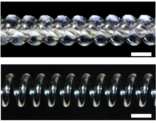 用于“扭热制冷”的钓鱼线。自螺旋(上图)和中空卷绕螺旋并固化(下图)的尼龙-6纤维图。纤维直径为0.6 mm。标尺:1.0 mm (上图) ,2.0 mm (下图).