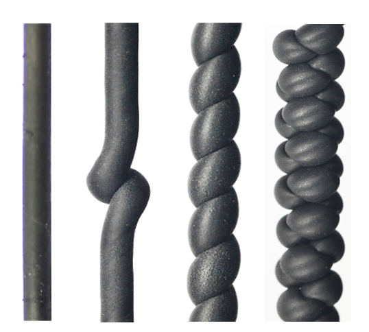 “扭热制冷”中,对橡胶纤维加捻会生成不同的结构:加捻、部分螺旋、全部螺旋、和超螺旋,橡胶直径:2.5 mm,预拉伸应变:200%。