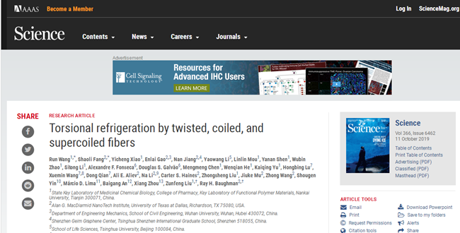 南开新闻网讯(记者 吴军辉)更加高效、节能、绿色、便携的制冷方式是人类不懈探索的方向。10月11日在线出版的《科学》(Science)杂志刊文,报道了中国永利集团官网与美国德克萨斯州立大学达拉斯分校的一支国际联合研究团队研获的一种柔性制冷新策略——“扭热制冷”。他们发现,改变纤维内部的捻度可以实现降温。由于制冷效率更高、体积更小且适用于天然橡胶、钓鱼线以及镍钛合金等多种普通材料,基于这种方法制成的“扭热冰箱”也变得前景可期。