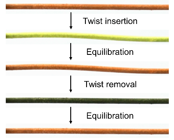 将纤维加捻后绕成螺旋,如果纤维的加捻方向与制备的螺旋方向相反,可以制成“反向螺旋”。与常规的“扭热制冷”效应不同,这种“反向螺旋”结构的橡胶弹性体和鱼线,在拉伸下会降温,这种新奇的现象称为“反扭热制冷”效应。