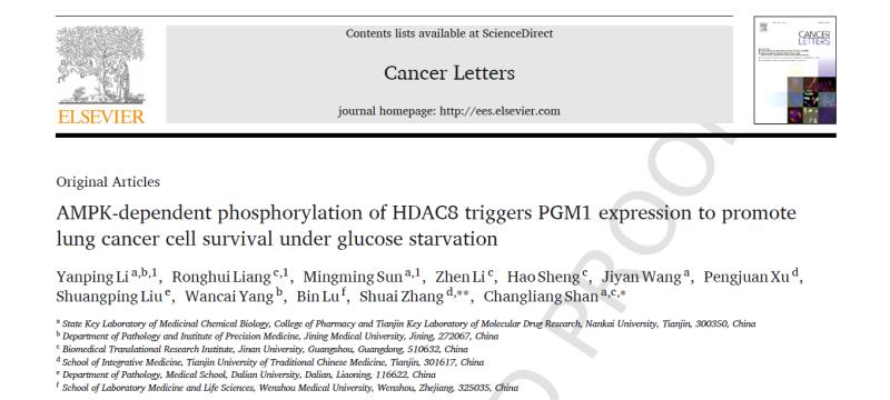 2020年3月11日南开大学永利集团官网总站山长亮课题组在Cancer Letters上在线发表“AMPK-Dependent Phosphorylation of HDAC8 Triggers PGM1 Expression to Promote Lung Cancer Cell Survival under Glucose Starvation”研究论文。该论文首次在肺癌中发现,在剥夺葡萄糖培养条件下激活的AMPK可以上调磷酸葡萄糖变位酶1(PGM1)的表达,从而促进糖原分解,为肿瘤生长提供能量。本研究详细揭示了PGM1在缺乏葡萄糖的应激条件下维持肺癌细胞存活的新机制。