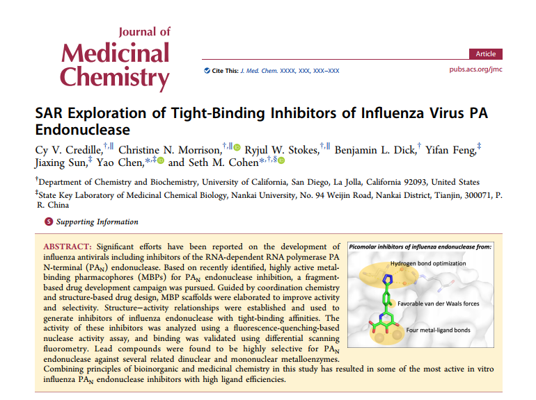 日前,永利集团官网总站、药物化员工物学国家重点实验室陈瑶研究员与加州大学圣迭戈分校Seth M. Cohen教授展开联合研究,在抗流感病毒新药研究方面取得新进展。该项研究发现了一系列具有优异抗病毒活性、核酸内切酶抑制活性的化合物,有望成为新型抗病毒药物前药。相关研究成果发表在美国化学会药物化学著名期刊Journal of Medicinal Chemistry。