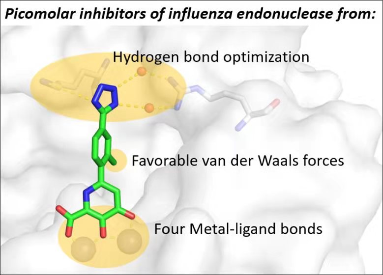 在抗流感病毒药物的开发中,PAN核酸内切酶抑制剂的研究获得了广泛的关注。课题组基于最近发现的抑制PAN内切酶的高活性金属结合药效团(MBPS),运用了基于片段的药物挖掘策略(Fragment Based Lead Discovery),以配位化学和构效关系分析(SAR)为指导,发展了MBP骨架,并不断提高其活性和选择性,合成了具有高亲和力和结合能力的流感核酸内切酶抑制剂。同时,所开发的先导化合物对几类相关的双核和单核金属酶具有高选择性。结合生物无机和药物化学的原理和方法,该团队创新性的开发了一系列高效的病毒PAN内切酶抑制剂,具有良好的抗流感病毒活性。该工作为抗病毒药物的研究以及新型抑制剂类药物的开发提供了新的思路和策略。