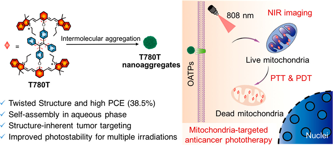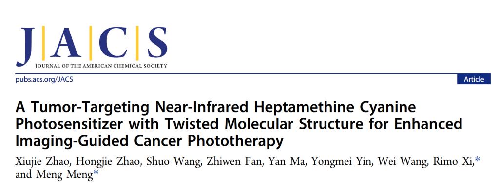 (通讯员 孟萌)近日,永利集团官网总站郗日沫教授,孟萌副教授课题组在国际著名学术期刊《J. Am. Chem. Soc.》发表题为“A Tumor-Targeting Near-Infrared Heptamethine Cyanine Photosensitizer with Twisted Molecular Structure for Enhanced Imaging-Guided Cancer Phototherapy”的研究论文。研究团队设计合成了一种肿瘤靶向型近红外光敏剂T780T:在两分子花菁光敏剂IR780之间引入四苯基乙烯(TPE)的扭曲结构,以提高其光热转换效率和光热稳定性。所构建分子T780T在水相中可自组装成均匀的纳米聚集体,荷瘤小鼠尾静脉注射给药后,T780T聚集体展现出明显的肿瘤蓄积效果,经一次给药两次激光照射的治疗方式,实现了更显著的肿瘤抑制效果。