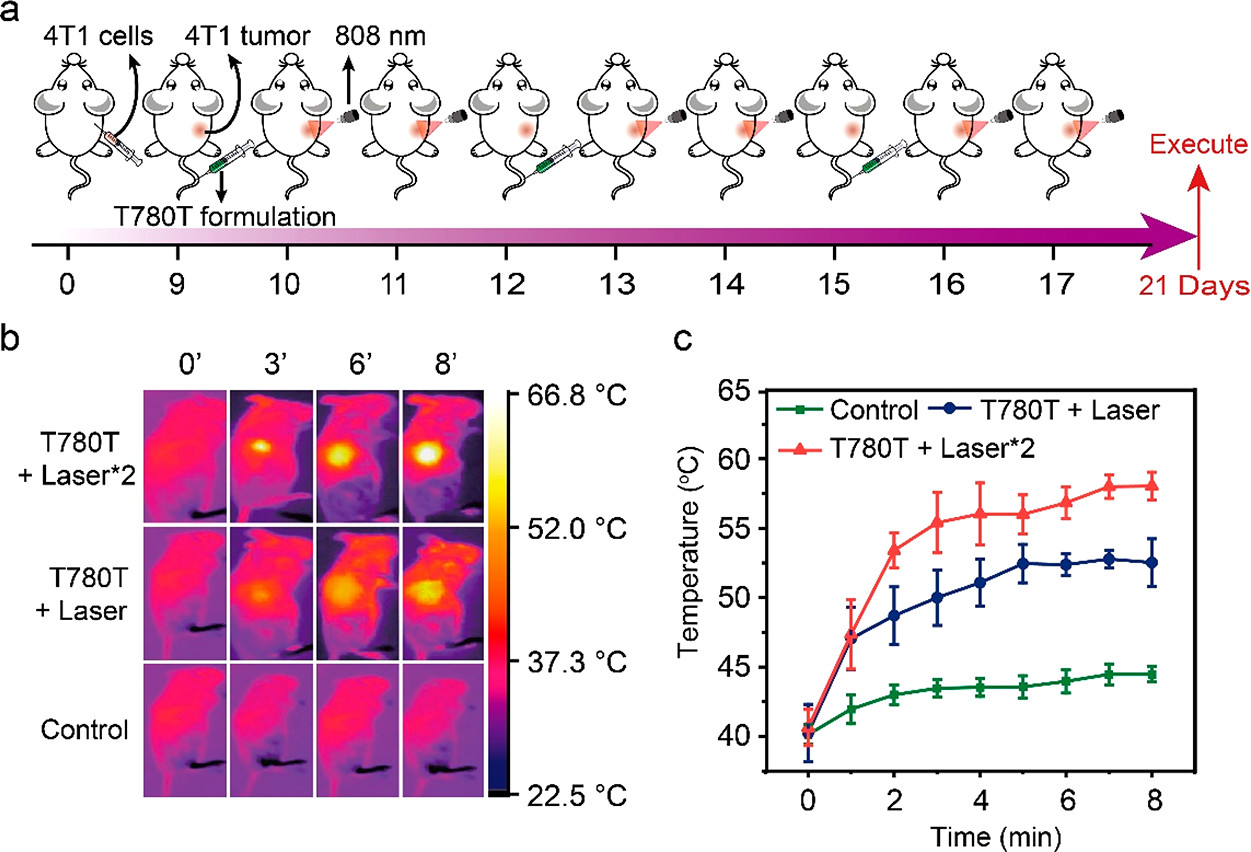 荷瘤小鼠静脉注射T780T纳米聚集体的PTT–PDT协同治疗及其肿瘤温度变化趋势(808 nm, 0.8 W cm−2)