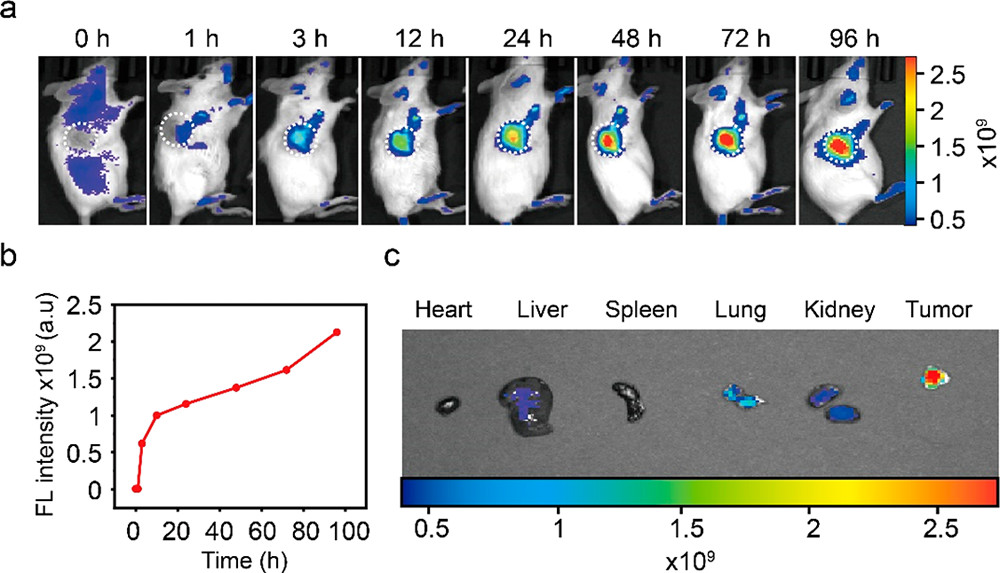 荷瘤小鼠静脉注射T780T纳米聚集体(100 μM, 100 μL)后的实时荧光成像(a, b)及给药24 h的组织分布结果(c)(Ex = 745 nm; Em = 800 nm)