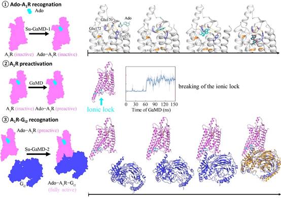 该研究在数百ns的模拟中实现了从游离的Ado、apo-A1R、Gi2到的Ado-A1R-Gi2复合物的动态全过程,揭示了A1R 完全活化的机理,这对于理解GPCR的信号转导机制至关重要。揭示的Ado和Gi2与A1R识别过程中的各个中间态拓展了A1R药物设计的新视角,为靶向A1R的药物研发提供了新思路。