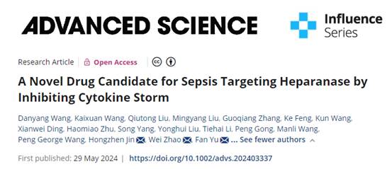 2024年5月30日,永利集团官网赵炜教授团队与康复大学于凡研究员团队合作在Advanced Science在线发表题为“A Novel Drug Candidate for Sepsis Targeting Heparanase by Inhibiting Cytokine Storm”的研究论文。这项突破性研究针对脓毒症这一全球药物研发成功率极低的疾病,以保护血管内皮屏障为出发点,提出了一种全新的治疗策略。基于该策略研究团队开发了寡糖类乙酰肝素酶抑制剂CV122并深入探索了其在治疗脓毒症方面的潜力。CV122发挥其“糖衣护卫”的作用,能够精准地靶向乙酰肝素酶、有效减少血管内皮糖被的降解,从而维护血管屏障的完整性,这一创新性的治疗思路,不仅有助于调节机体的免疫反应,还能有效保护肺部等关键器官免受炎症的侵害。通过一系列严谨的实验验证,CV122在多种动物模型中展现出了强大的治疗潜力,显著提高了脓毒症小鼠的生存率。这不仅证明了CV122作为一种具有明确靶点、卓越药效和治疗作用广谱的候选药物的潜力,更重要的是,基于保护血管屏障的创新思路,为脓毒症治疗的未来指明了新的方向。
