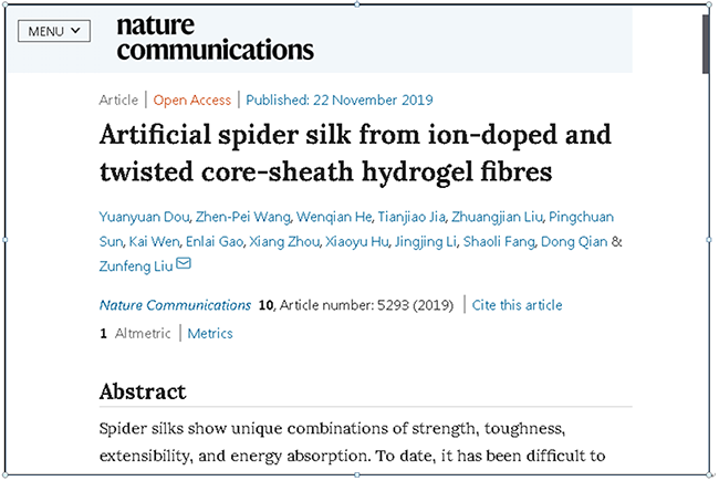 经过反复试验,刘遵峰团队采用了一种非常简单的方法,成功使用水凝胶纤维制备出了“人造蜘蛛丝”。这种新材料达到与天然蜘蛛丝几乎相当的力学性能。刘遵峰介绍,水凝胶纤维由聚丙烯酸制成,聚丙烯酸具有核-鞘结构,通过掺杂二价离子、并加捻获得一定的捻度极大的增加了其强度。该纤维的拉伸强度可达895MPa、拉伸可达44.3%、模量高达28.7GPa、韧性达到370MJ m-3,阻尼效率达到95%。