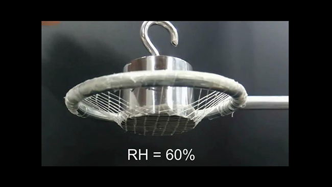 实验视频显示,使用“人造蜘蛛丝”制成的“球拍”,在金属重物快速下坠时,缓慢拉伸,实现了很好的缓冲。同时,在湿度增加的条件下,“球网”又缓慢恢复原状。