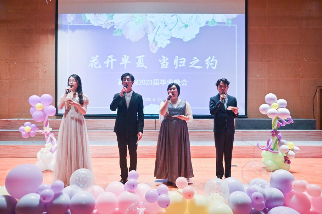 晚会现场用气球和花朵装饰,在入场处为毕业生学子铺设红毯花路,并写有毕业祝福。晚会开始前播放了教师代表祝福视频,为晚会营造温暖的开场氛围。晚会分为“韶光似水,青春不散”、“岁月漫长,感恩相伴”、“山水再逢,不胜欣喜”三部分,由回忆到感恩再至祝福。毕业生代表们演唱了《老男孩》、《入海》、《再见》等毕业歌曲,重温自己美好的校园时光,感怀好友的陪伴;老师们也用歌声献上自己的祝福,《等你下课》、《凤凰花开的路口》、《如愿》等歌曲在小音乐厅唱响。此外,毕业生代表杨杰秋和辅导员李业广作为两名退伍军人,共同带来诗朗诵《那些难忘的日子》;非毕业年级同学也为即将毕业的师兄师姐带来相声助阵。