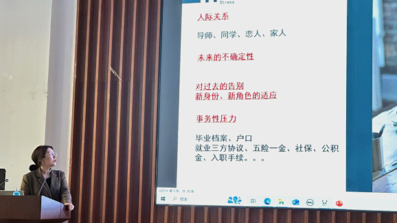 讲座伊始,迪丽热巴老师通过破冰游戏和调研数据,提示毕业季将会面临学业、就业、经济、人际关系及身份转变等多维度压力。她指出,压力的根源在于个体对情境的解读及应对资源的不足,而非情境本身。