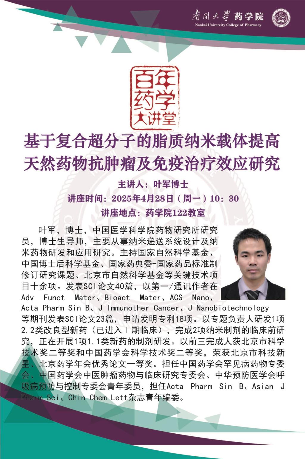 百年药学大讲堂——叶军研究员学术报告2025/04/24