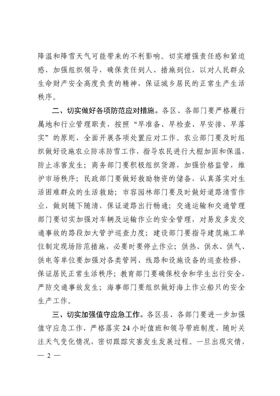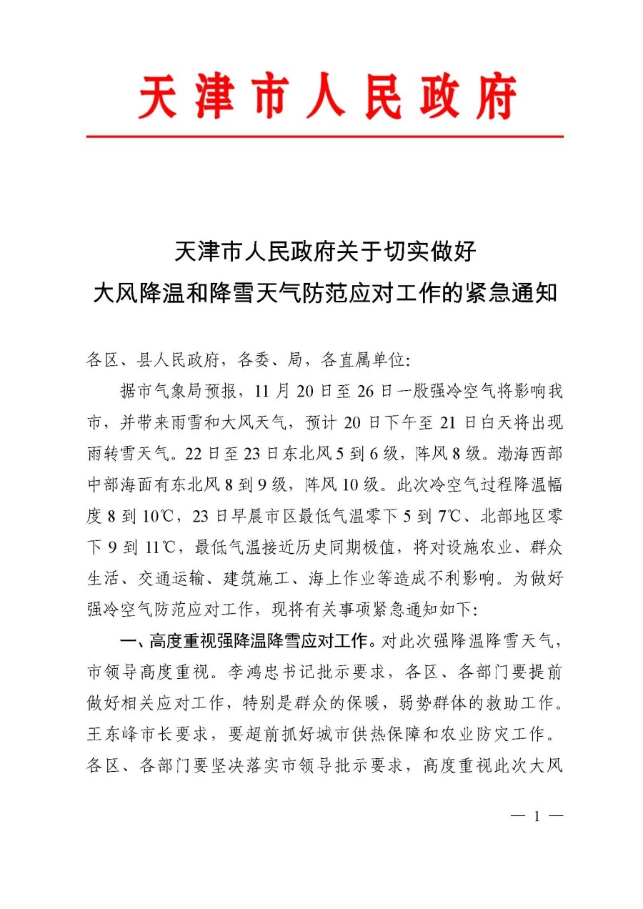 天津市人民政府关于切实做好大风降温和降雪天气防范应对工作的紧急通知