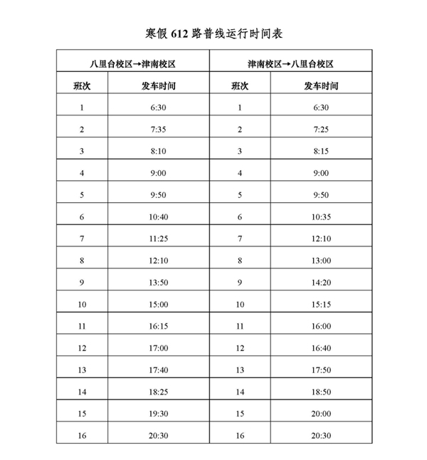 南开新闻网讯(记者 聂际慈)记者日前获悉,为满足寒假期间津南校区值班人员及留校师生交通需求,结合假期客流情况,接待服务中心经与天津公交集团二公司协商,决定自2017年1月19日至2月9日(含周六、日及法定节假日)实行寒假运行方案。