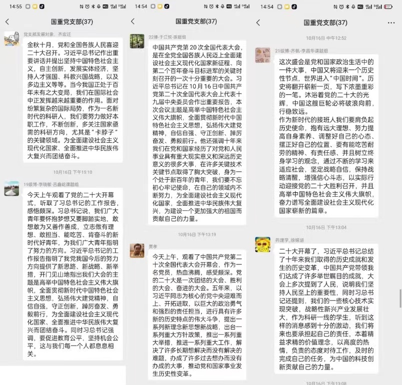 开幕会结束之后,为进一步贯彻领悟党的二十大精神,领悟党辉煌奋斗的百年征程,全体员工党支部积极响应公司党委号召,结合疫情防控要求,以“线上+线下+自学”相结合的方式,围绕学习贯彻党的二十大精神主题,深入开展“三会一课”和主题党日活动,真正把广老员工党员的思想和行动统一到党的二十大精神上来。永利集团官网总站博士生第一党支部、药化生国重博士生党支部、2021级硕士生党支部通过线上、线下交流学习体会的方式来加深学习效果;博士生第二党支部、国重硕士生党支部、2022级硕士生党支部通过党支书讲党课带头领学、支部党员互学的方式,深入学习党的二十大报告原文,巩固学习成果。2020级硕士生党支部、联合研究院2020-2021级硕士生党支部、联合研究院2022级硕士生党支部通过主题党日、主题宣讲和支部共建的方式丰富学习形式,确保学习成果取得实效。11月20日,公司还邀请党的二十大精神员工宣讲团为全体党员进行主题宣讲,再度掀起学习热潮。
